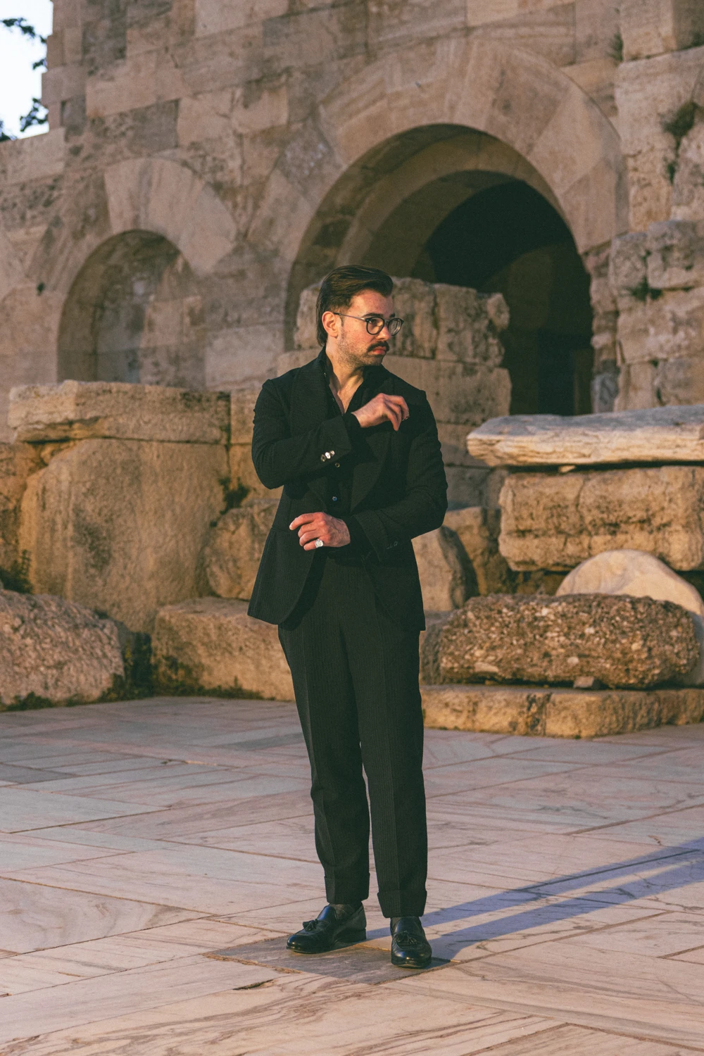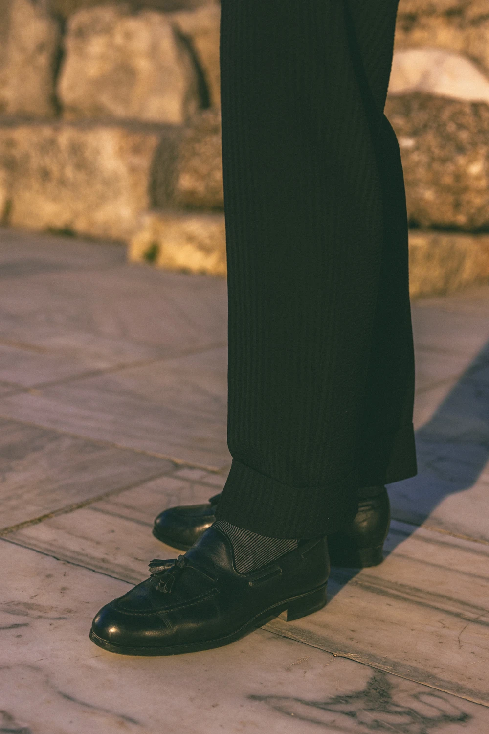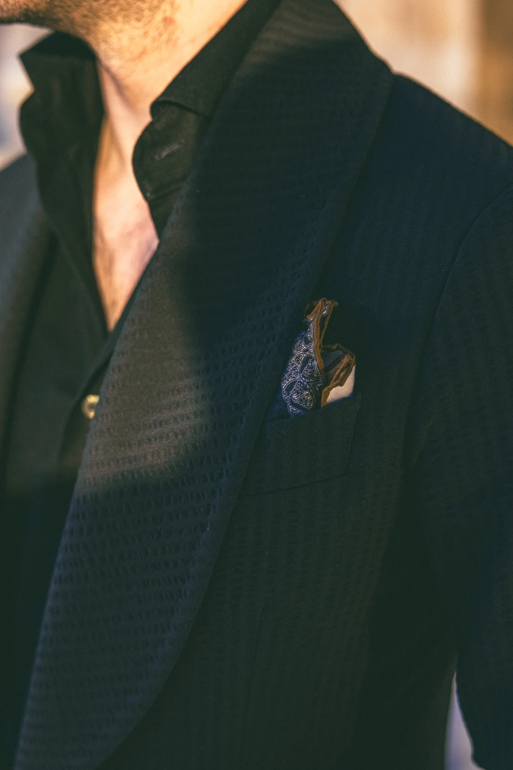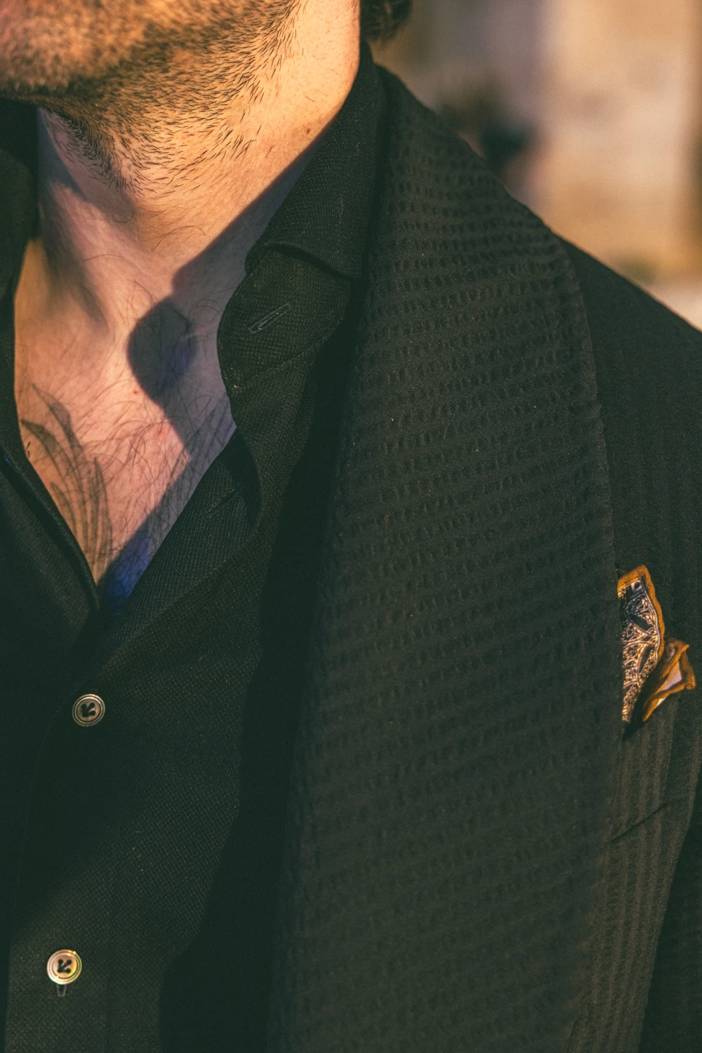 Nie oznacza to jednak, że nie można połączyć czarnej koszuli z czarnym garniturem – będzie to po prostu nadal zestaw nieformalny i bardziej w klimacie wieczorowym, imprezowym. Nasz pomysł to garnitur wykonany z wełny seersucker, czyli kory, a także koszula uszyta z bawełnianego jerseyu marki Loro Piana. Do tkanin wrócimy za chwilę, natomiast chwilowo skupimy się na samym kroju ubrań, a także możliwym zastosowaniom.