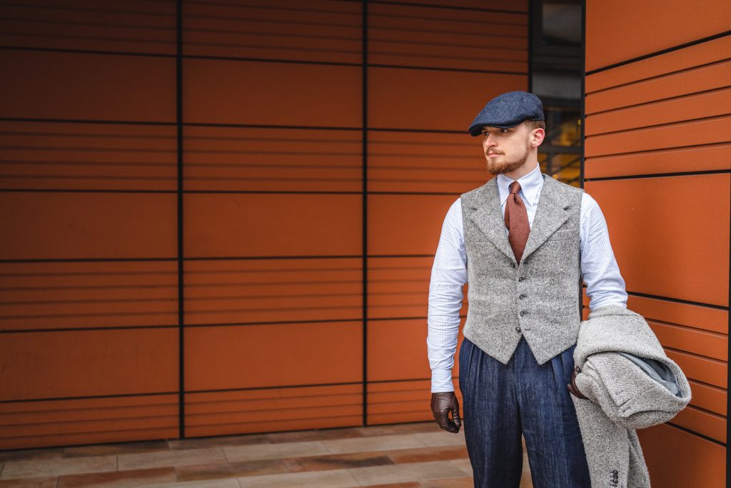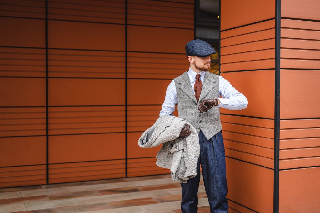 Tomasz ma na sobie kaszkiet marki Stetson – mimo że jest to element garderoby uznawany przez wiele osób za „dziadkowy”, to naszym zdaniem można go bardzo łatwo wkomponować w styl codzienny. Kaszkiety są niezwykle uniwersalne, należy po prostu zadbać o nowoczesny kształt i dobre dopasowanie do głowy, dzięki czemu nie będzie wyglądał na za duży. Kolorystycznie kaszkiet dobraliśmy do jeansów, tworząc subtelną klamrę kompozycyjną.