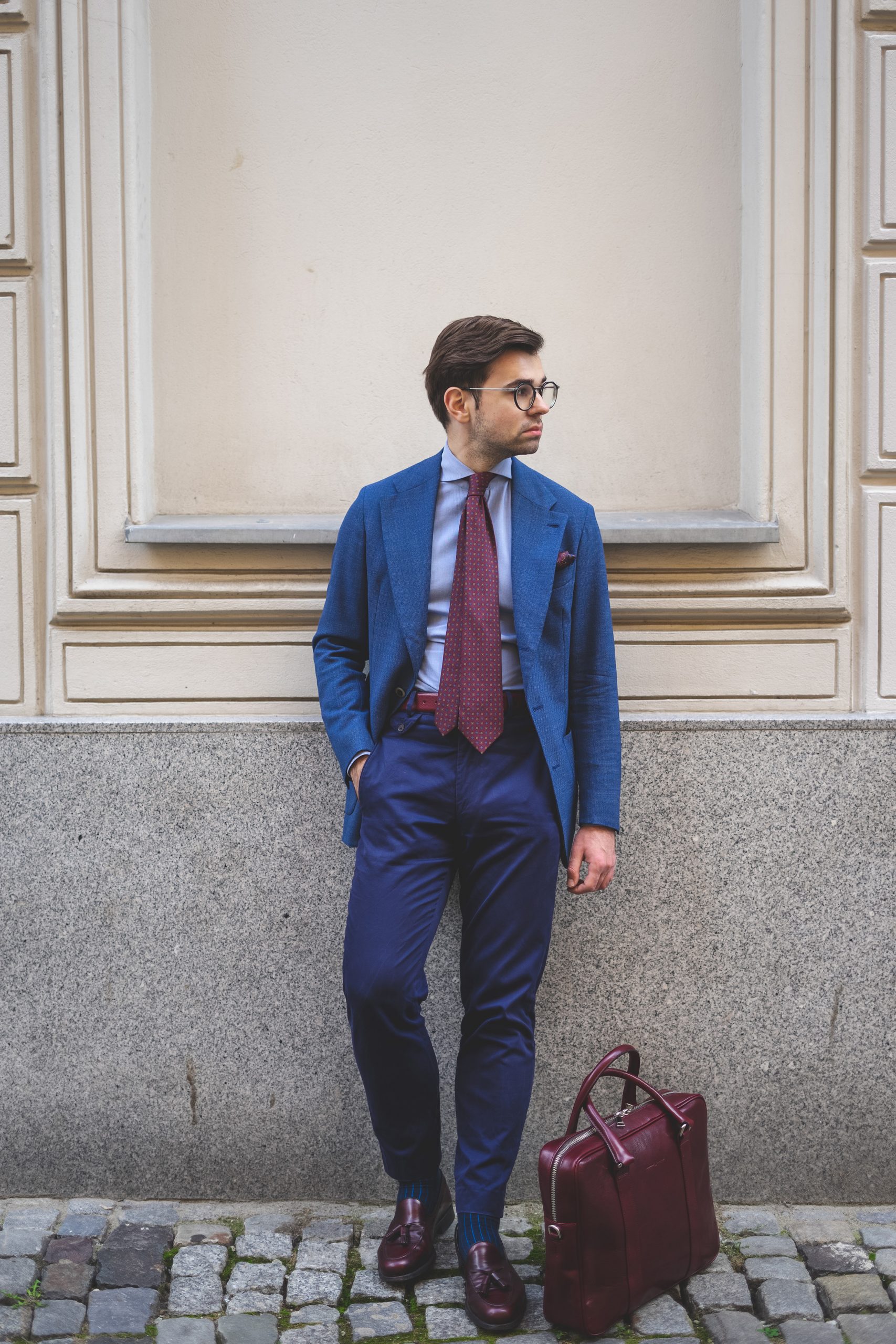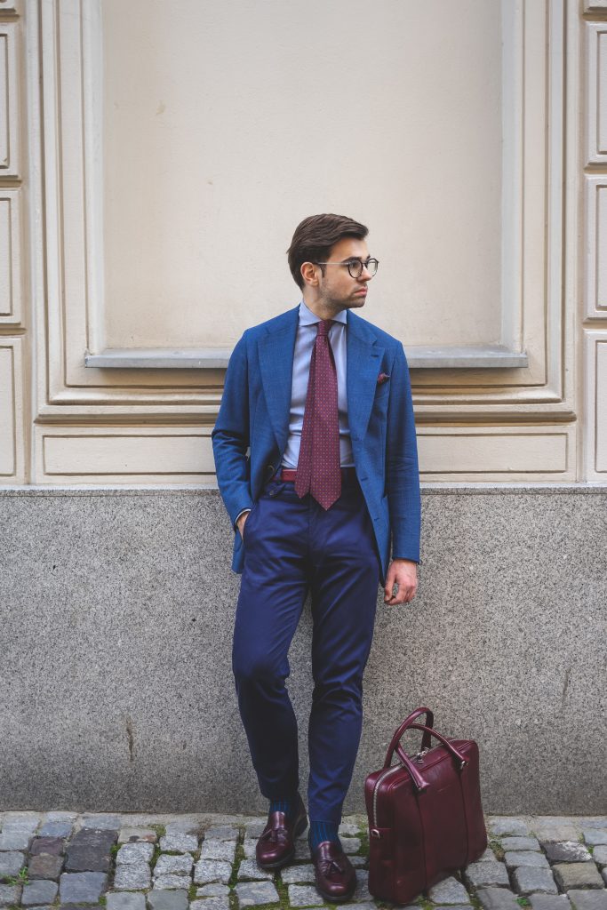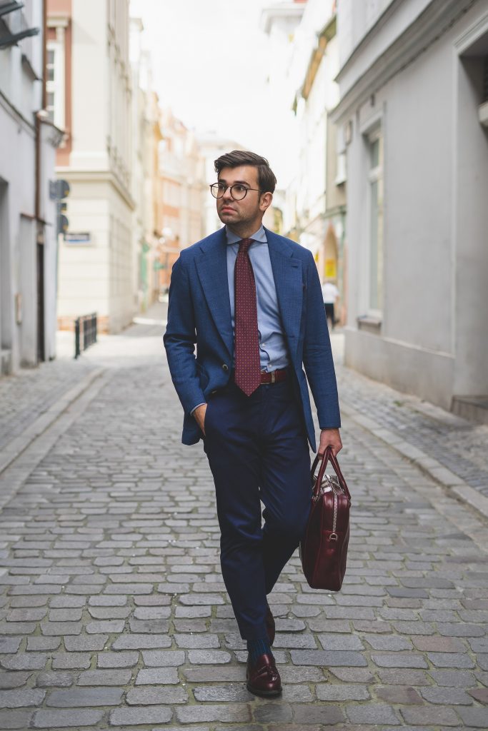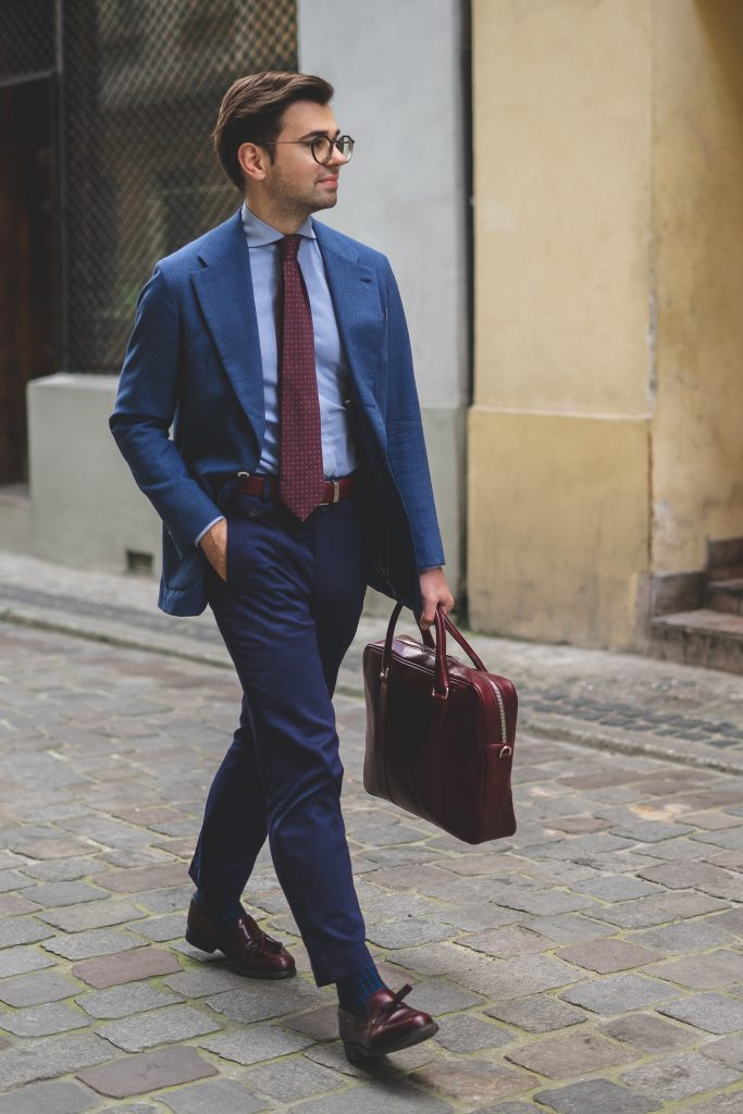 Pierwszy zestaw to stylizacja stricte biznesowa, gdzie wybijają się mocno dwa kolory – niebieski oraz bordowy. Marynarkę uszytą na miarę w naszej pracowni połączyliśmy z niebieską koszulą oraz granatowymi chinosami, dzięki czemu uzyskaliśmy bazę zestawu monochromatycznego. Żeby jednak nie było nudno, pomyśleliśmy też o innym kolorze: mamy więc bordowe buty tassel loafers Berwick oraz korespondujący bordowy pasek uzupełnione o bordowy krawat w subtelny wzór ornamentowy.