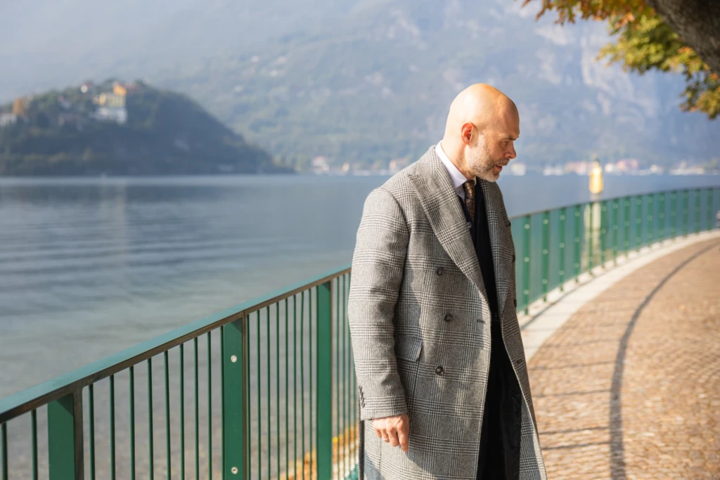 Dwurzędowy płaszcz szlafrokowy został uszyty z szarej wełny z alpaki w dużą kratę księcia Walii francuskiej marki Dormeuil. Mimo sporego wzoru nie wybija się on aż tak bardzo ze względu na stonowaną kolorystykę – mimo wszystko jednak jasny płaszcz jest sporym przełamaniem konwencji, szczególnie w naszym klimacie. Dzięki wielowymiarowej strukturze jednak płaszcz dobrze znosi spacer w większym czy mniejszym deszczu i nie trzeba się aż tak bardzo o niego martwić. Po wyschnięciu można go ewentualnie wyszczotkować i nadal się nim cieszyć.